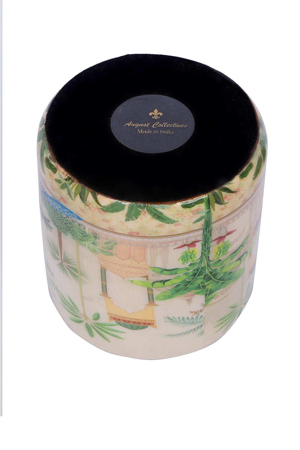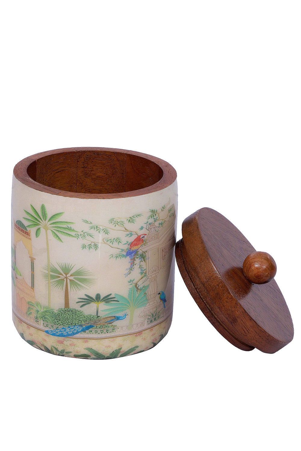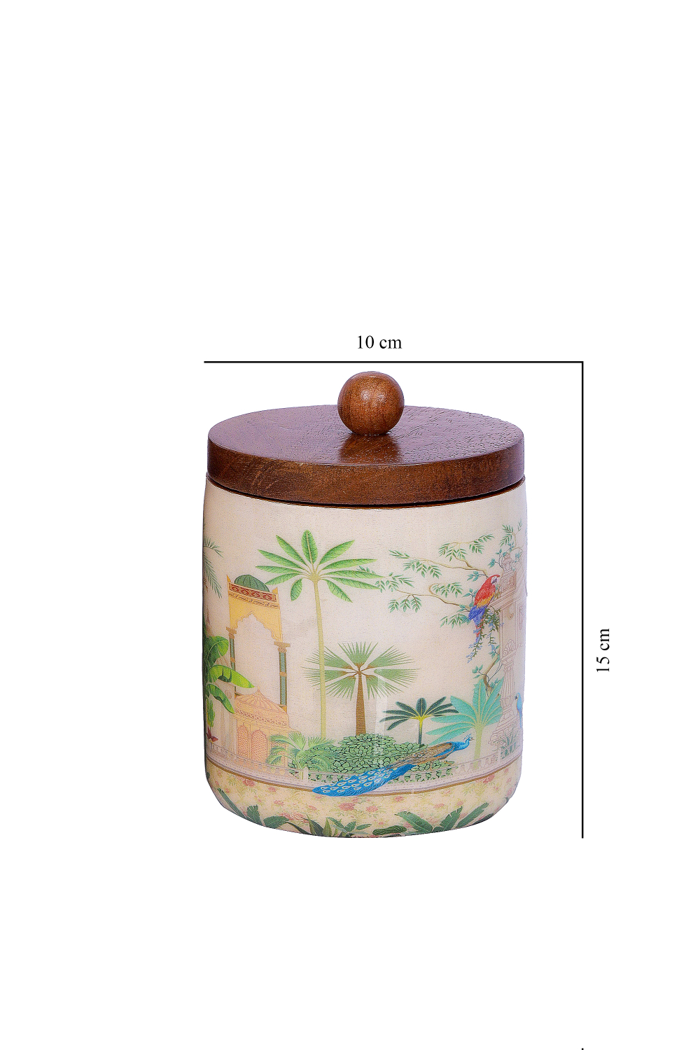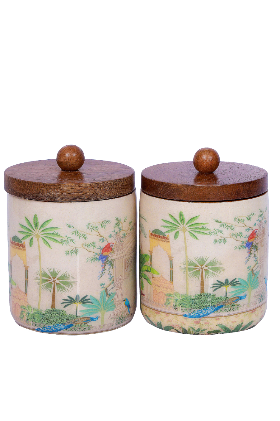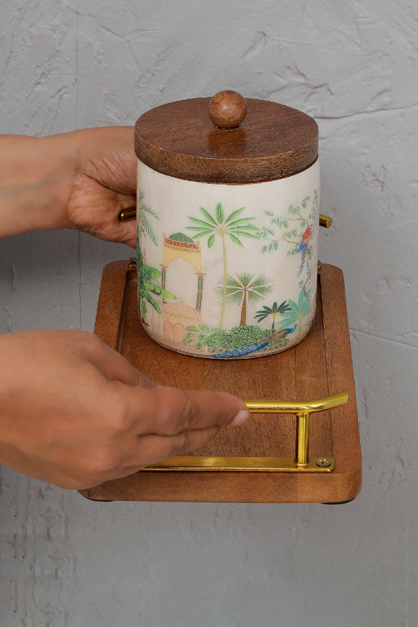 Twilight meets tradition in our Dancing in the Dusk storage jars. These two storage jars are paired with Sustainable mangowood tray along with gold metal handles. This elegant set of two food-safe jars in Mangowood brings together moody dusk tones, delicate floral motifs, and timeless craftsmanship — perfect for those who find beauty in the quiet moments of the day. Whether storing dry snacks, savouries, coffee, or your favorite teas, these jars are as functional as they are poetic.