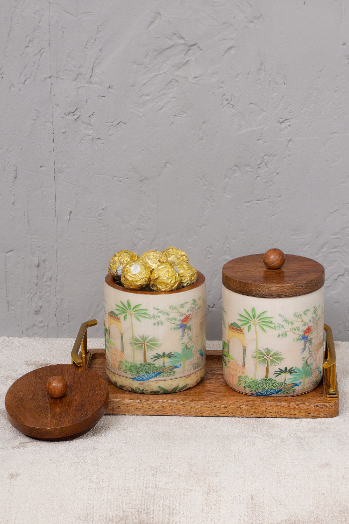 Material: Storage Jars- Mangowood / Tray- Mangowood with Metal Handles