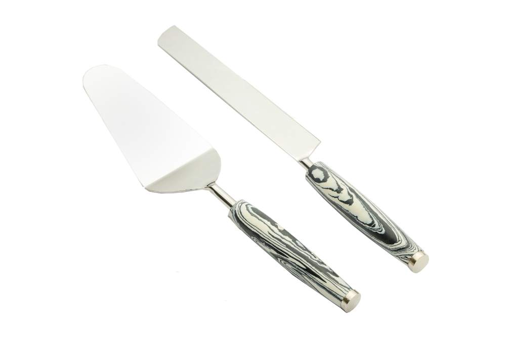 Slice your cake in style with this elegant set of 2 Stainless steel cake Serving set with a black composite stone handle and silver finished blades. The blunt-edged cake spatula is for serving the slice of cake while the sharp-edged knife is for slicing and serving cakes, Savories, and cupcakes with a hassle-free experience. Check out our coordinated Bar tools and Cheese Knives in the same look.