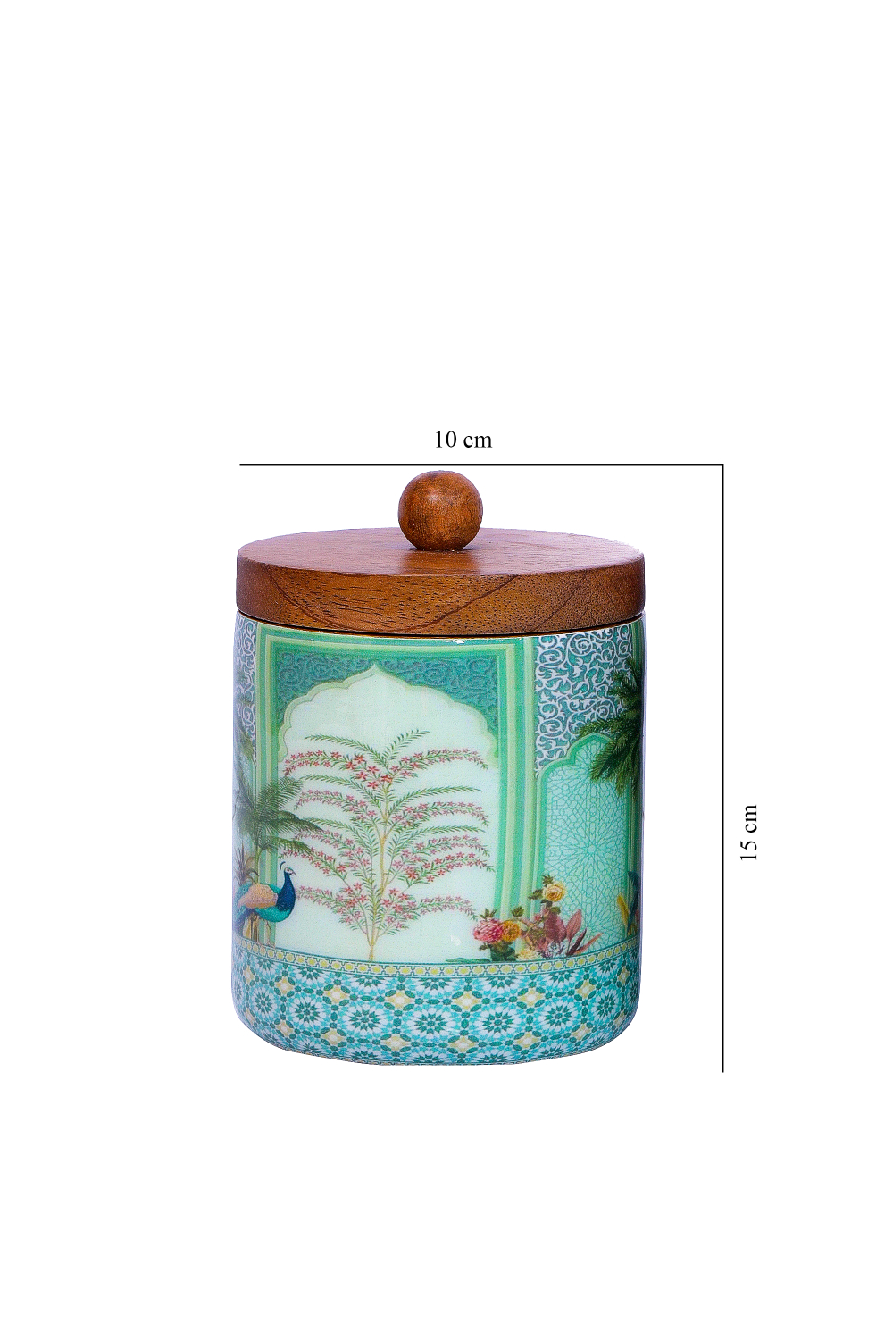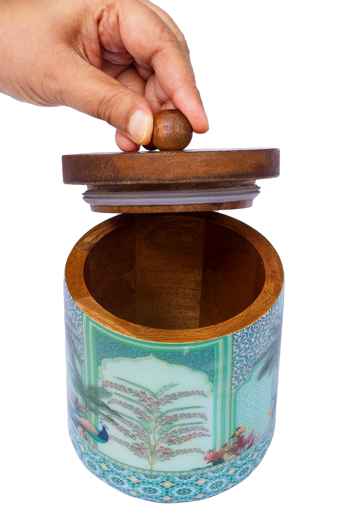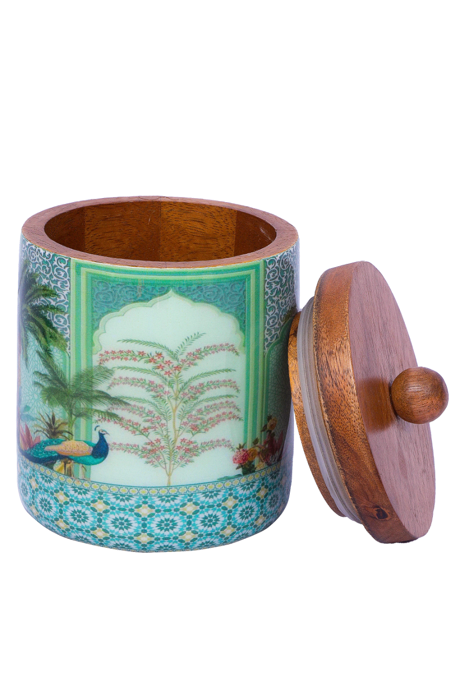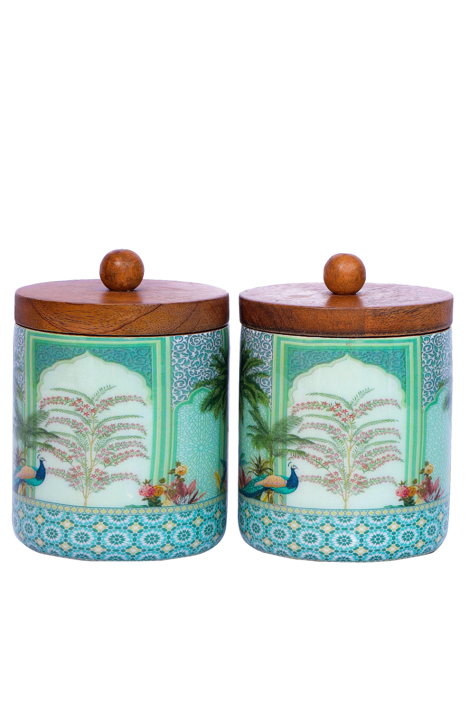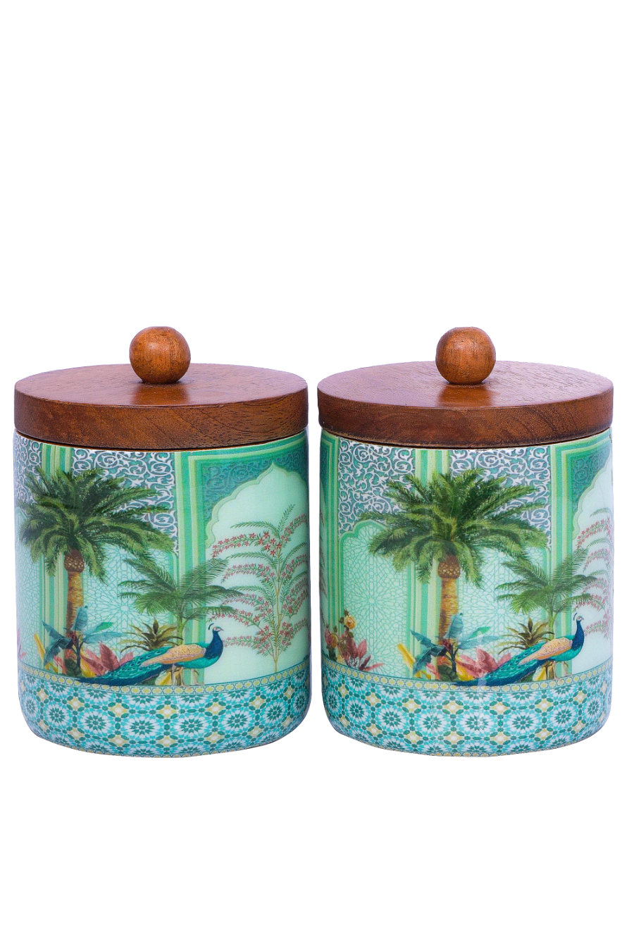 Infuse your space with the earthy elegance of the Morbagh collection. Inspired by the timeless beauty of royal peacock gardens, this tray is adorned with intricate patterns and vibrant hues that echo the grandeur of India’s regal past. This set includes two beautifully crafted storage jars made from foodsafe, sustainable mango wood, perfect for storing dry ingredients, treats, or small essentials. The jars are paired with a matching mango wood tray that highlights the natural grain and warmth of the wood, while gold metal handles add a touch of sophistication and easy portability. A perfect blend of functionality and style, this set brings a refined, organic charm to your kitchen or dining table.