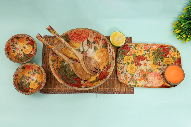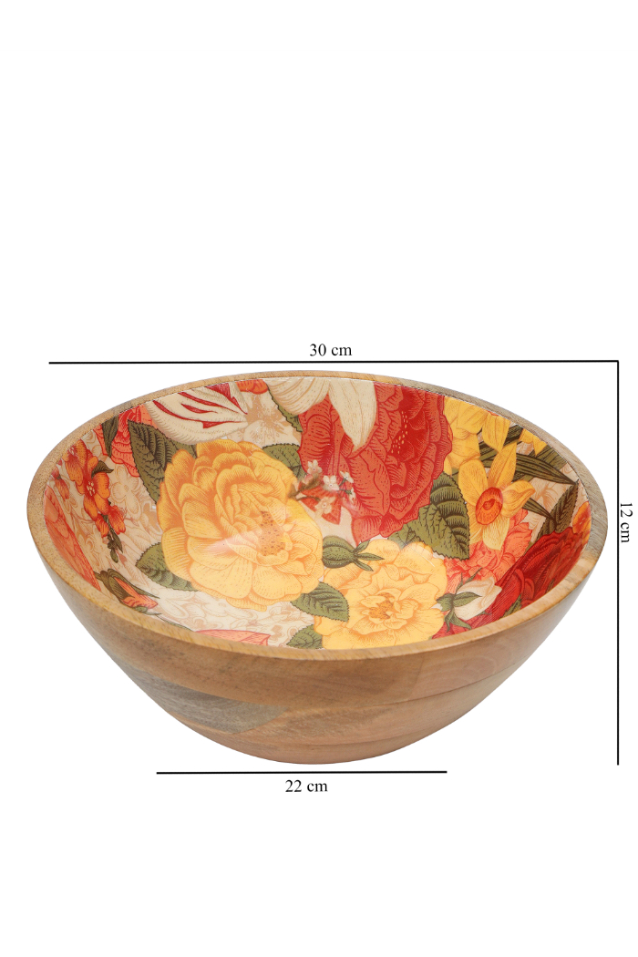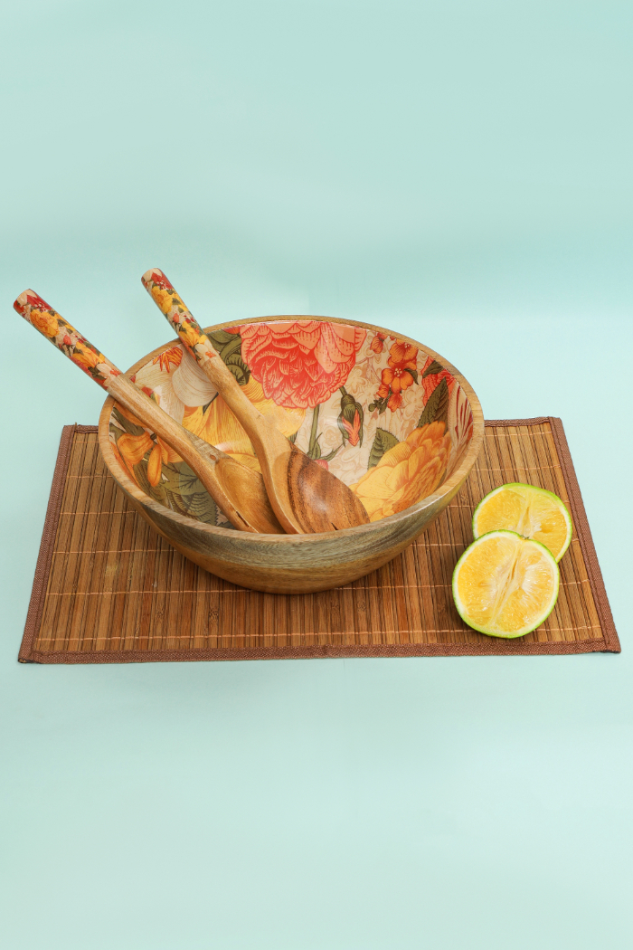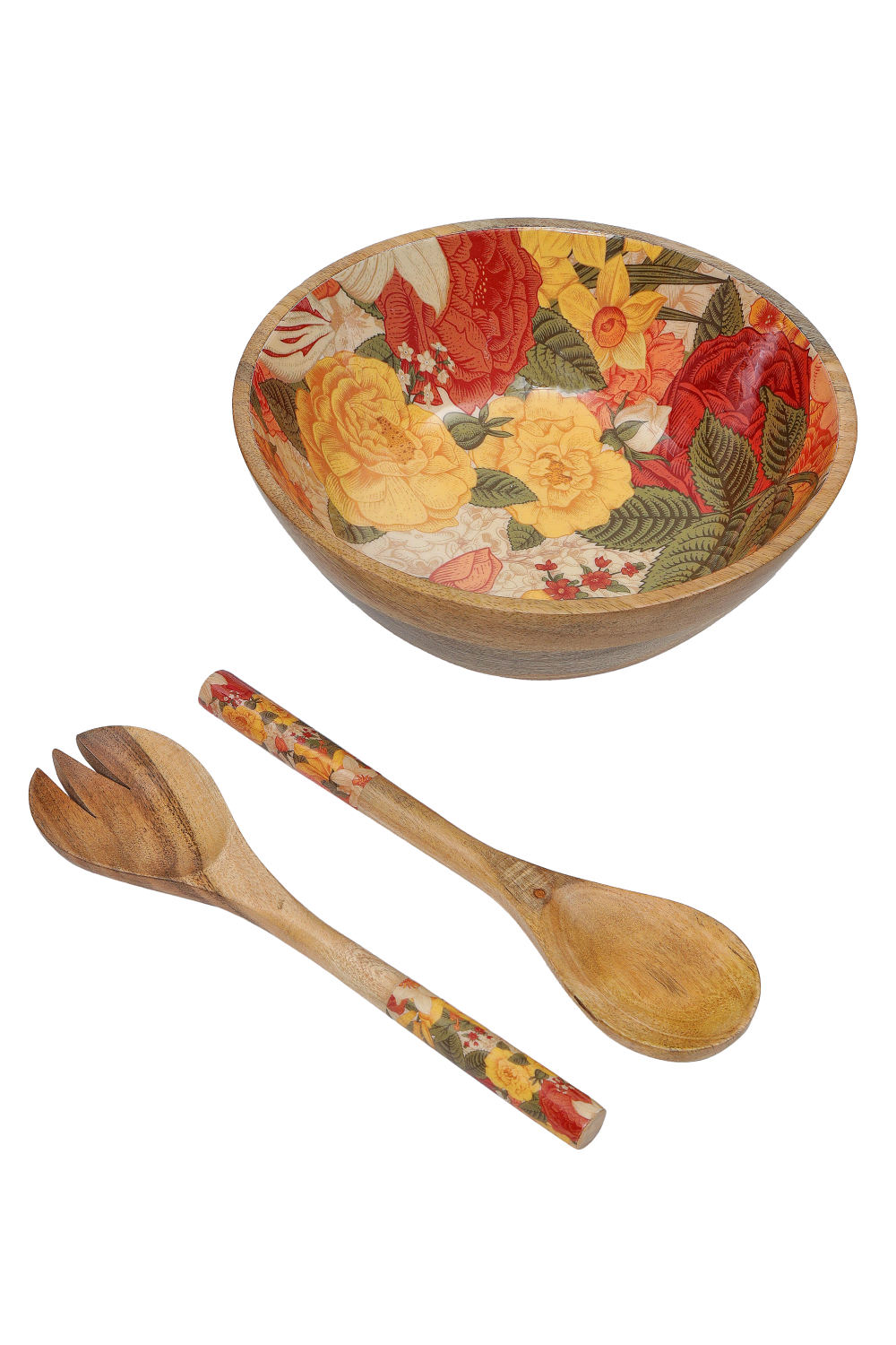 Bring nature's charm to your table with this vintage garden print salad bowl, beautifully handcrafted in mango wood. Adorned with delicate floral motifs, it comes with a matching set of 2 mango wood salad servers for effortless tossing and serving. Perfect for fresh salads, fruits or pasta, this set blends rustic warmth with timeless elegance, making every meal feel special. They are an awesome gifting idea for almost any occassion.