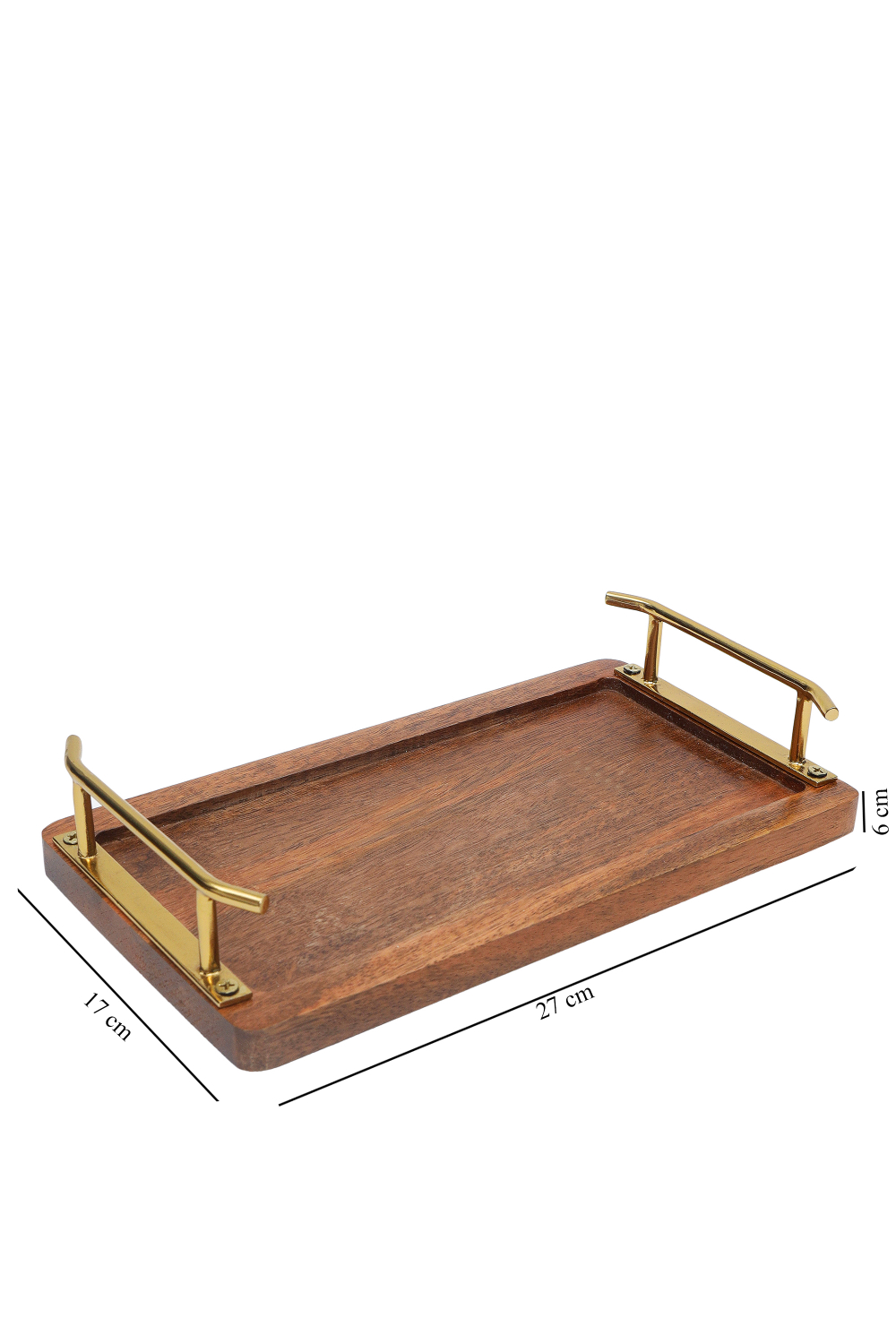 Elevate everyday serving with the natural charm of this mango wood tray. Expertly crafted from sustainable mango wood, it showcases rich grain patterns that bring warmth and character to any setting. Gleaming gold metal handles add a refined touch and make carrying effortless. Perfect for presenting snacks, beverages, or simply as a decorative accent on your table or console, this tray blends timeless beauty with practical elegance.