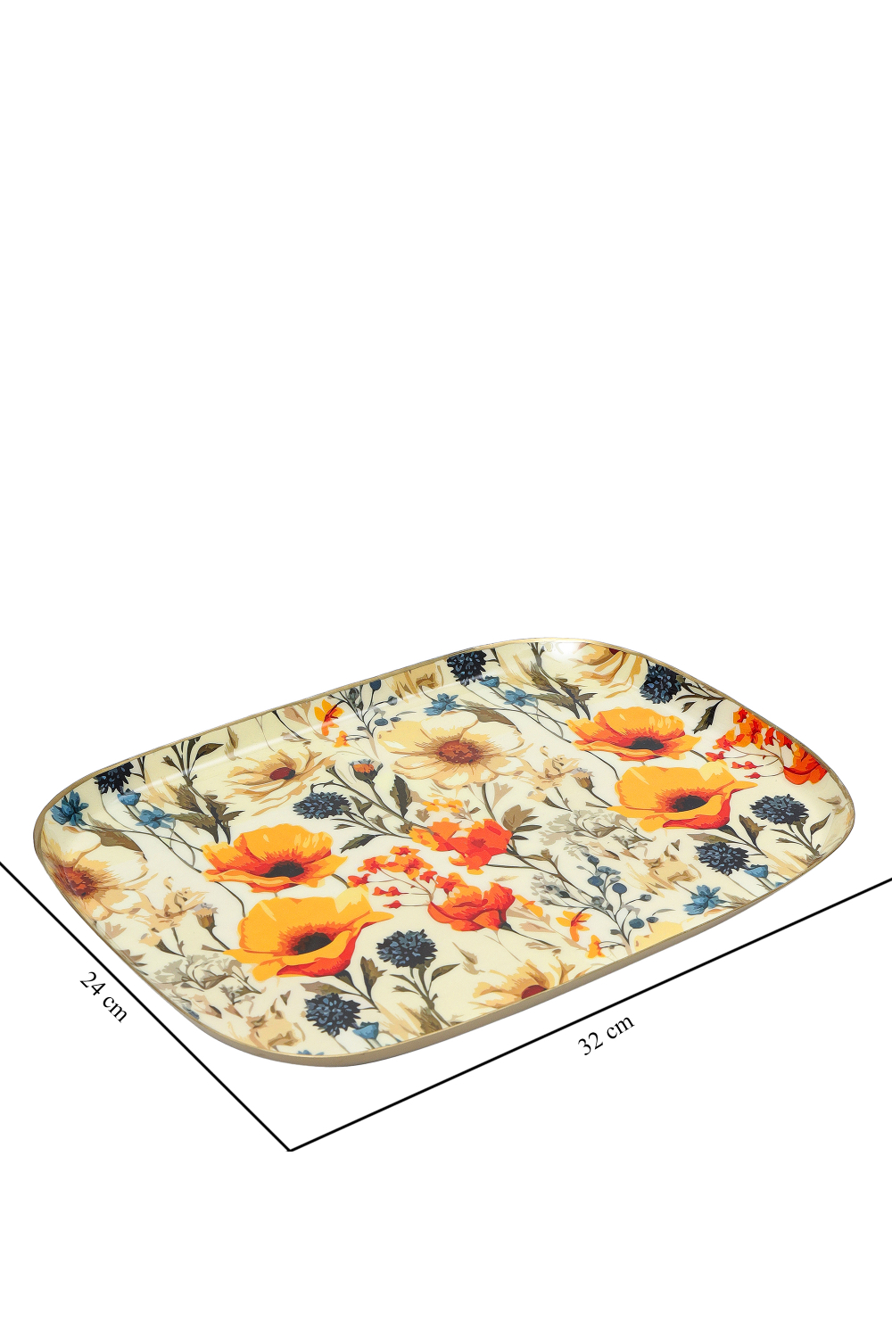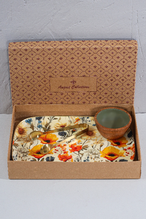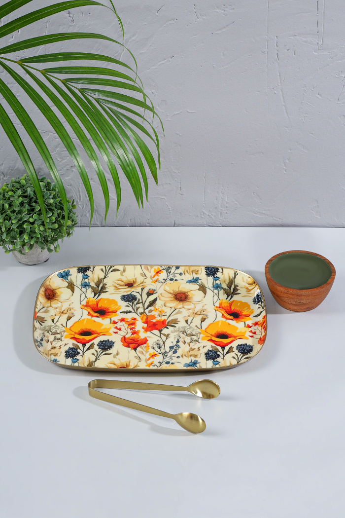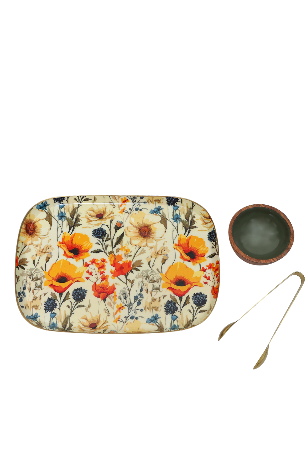 A masterpiece of artisanal craftsmanship and timeless elegance. The rectangle exquisite platter with slightly rounded corners is adorned with a food safe enamel coating. Featuring a captivating array of garden flowers, it evokes the charm and beauty of a flourishing garden. Complementing the metal platter is a mango dip bowl, adding a rustic and organic element to the ensemble ideal for serving snacks.