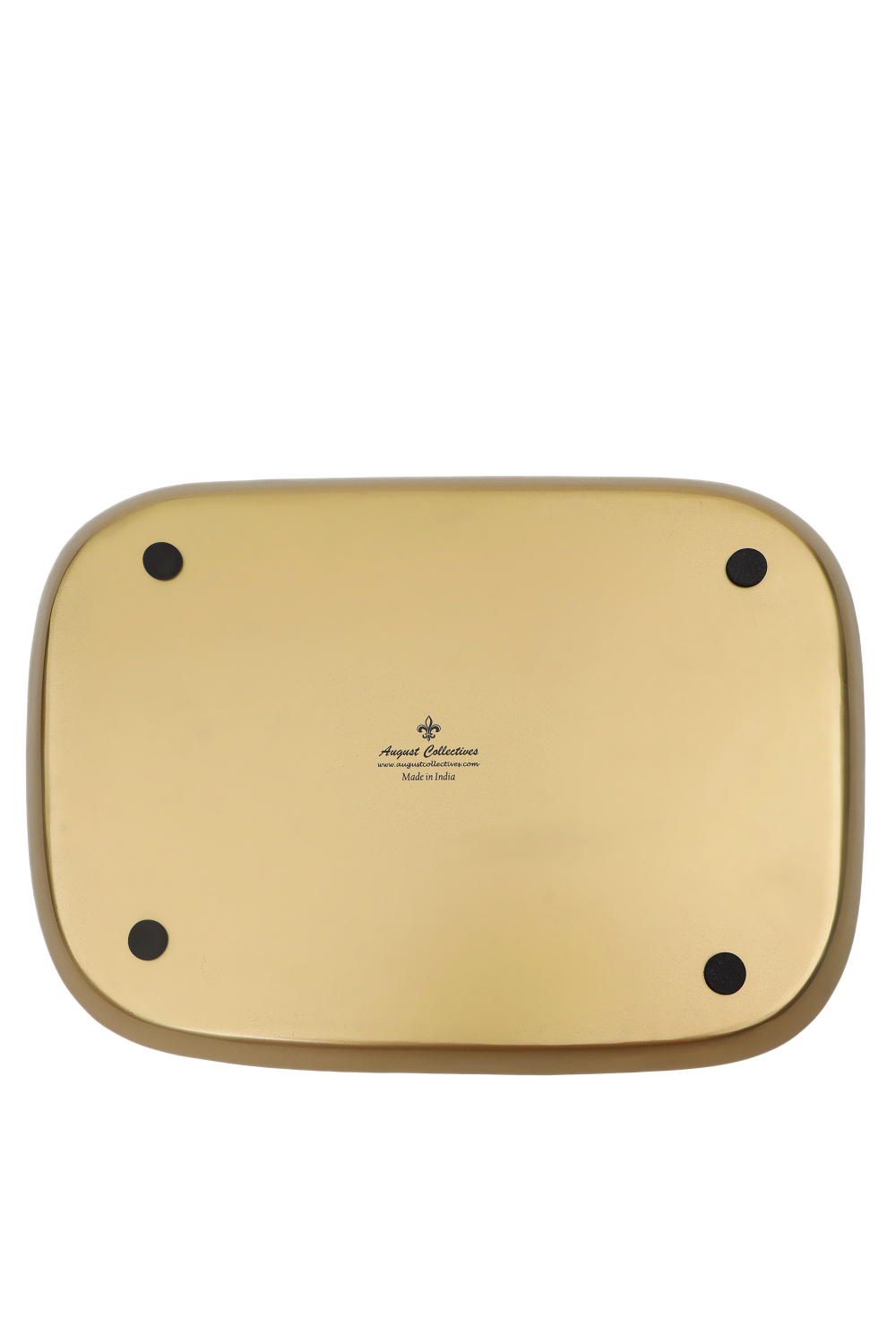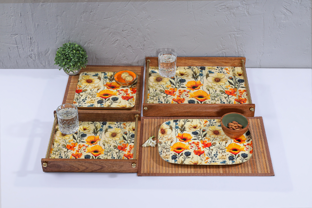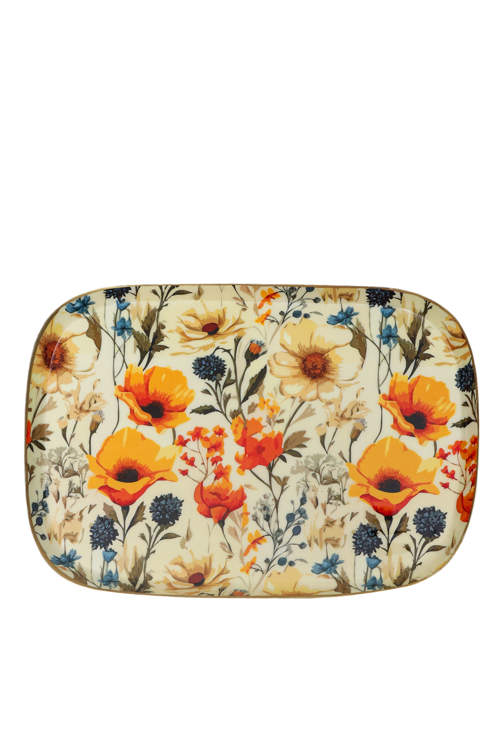A masterpiece of artisanal craftsmanship and timeless elegance. The rectangle exquisite platter with slightly rounded corners is adorned with a food safe enamel coating. Featuring a captivating array of garden flowers, it evokes the charm and beauty of a flourishing garden. Complementing the metal platter is a mango dip bowl, adding a rustic and organic element to the ensemble ideal for serving snacks.