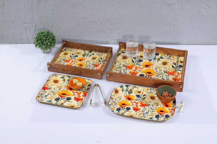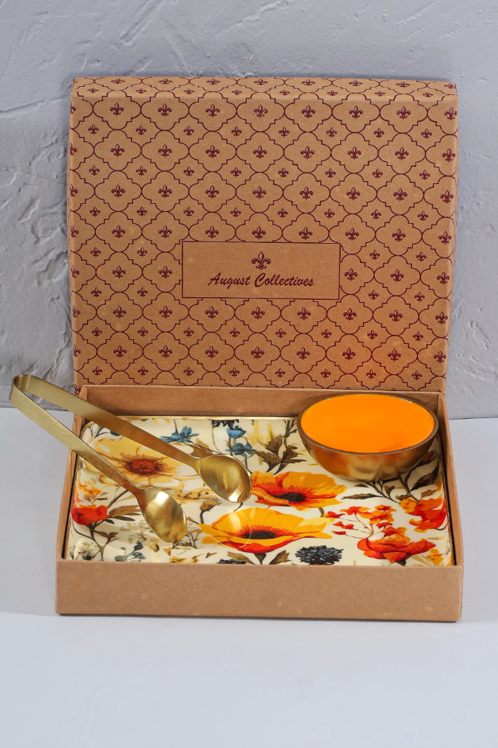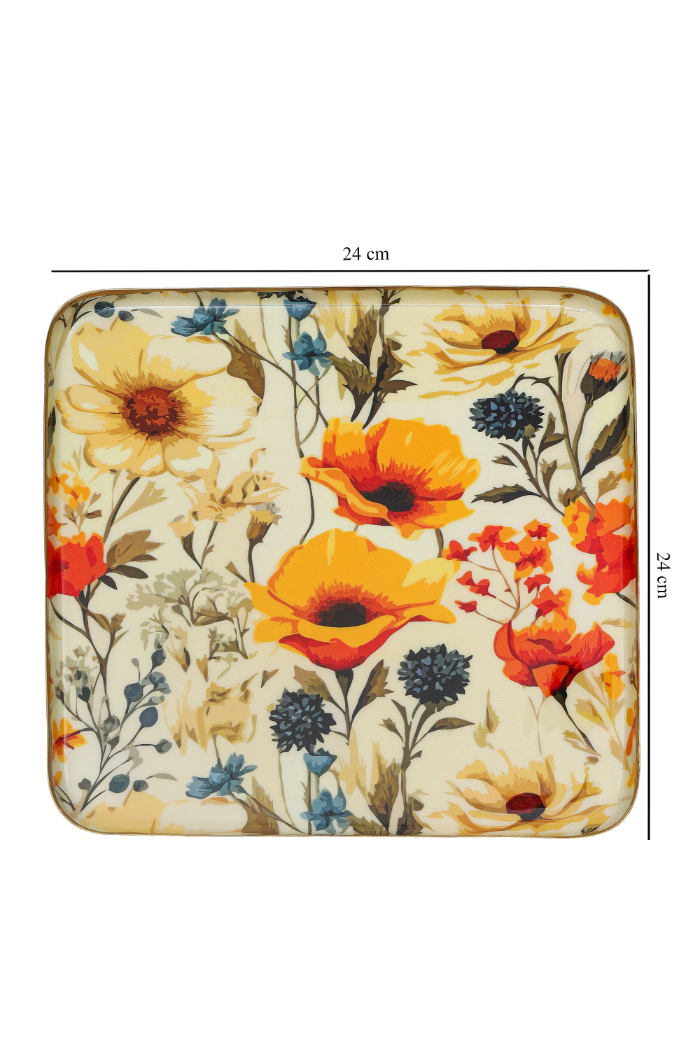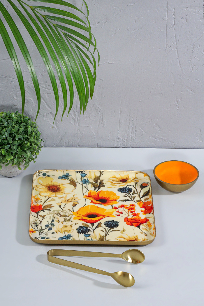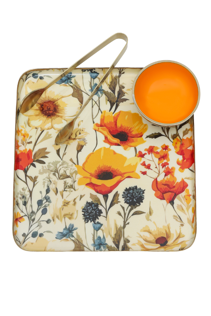 A fusion of vintage-inspired beauty and modern sophistication. A perfect blend of elegance and functionality for your table setting, this stunning platter showcases a captivating array of garden flowers with vibrant hues of crimson, coral and yellow It evokes the timeless charm of a blooming garden in full splendor. Nestled within the platter is a metal dip bowl handcrafted from metal coated with food safe enamel a sleek contrast to the vintage-inspired design. Handcrafted from high-quality materials, the metal platter is sturdy and durable, providing a stable platform for serving.